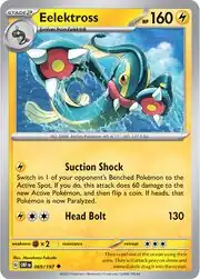 Eelektross (Japanese: シビルドン Shibirudon) is a Lightning-type Stage 2 Pokémon card. It is part of the Obsidian Flames expansion.