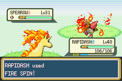 The target is now able to attack during Fire Spin's duration, and can act normally. Instead, it inflicts 1/16 of the target's maximum HP as damage for two to five turns upon use, in addition to the damage dealt when it is used. The quote "<Pokémon> was trapped!" will appear. It also traps the target, preventing switching and escape. If the user switches out, the target will be freed. If a trapped Pokémon uses Rapid Spin, it will be freed.