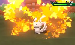 Ponyta kicks its two back feet outwards and the flames on its tail stretches and curves. Multiple orbs of fire surrounded in a fiery aura also shoot out of its mane and spin around in circles behind it. A huge horizontal vortex of fire then shoots out from Ponyta's body behind it. As the opponent becomes trapped in the vortex of fire, the orbs of flames dart around and hit the opponent as well. | ||