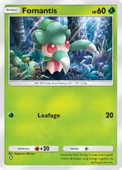 Fomantis (Japanese: カリキリ Karikiri) is a Grass-type Basic Pokémon card in Pokémon Trading Card Game Pocket. It is part of the Celestial Guardians expansion.