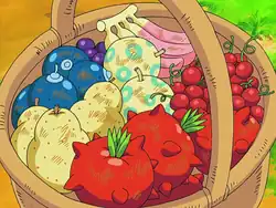 Introduced in the Generation II games, Berries are a type of item which, unlike Potions or Vitamins, are portrayed as food rather than medicine. A Pokémon may hold this item and, if needed, eat it during a battle to heal itself or cause other effects. In Generation III onwards, these can be planted and harvested by the player. These Berries have names and designs based on real-world fruits and vegetables.