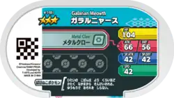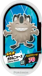Galarian Meowth (Japanese: ガラルニャース Galarian Nyarth) is a Grade 3 Pokémon Mezastar tag. It is part of the first Gorgeous Star set.