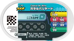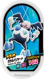 Galarian Mr. Mime (Japanese: ガラルバリヤード Galarian Barrierd) is a Grade 3 Pokémon Mezastar tag. It is part of the first Gorgeous Star set.