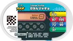 Galarian Stunfisk (Japanese: ガラルマッギョ Galarian Maggyo) is a Grade 3 Pokémon Mezastar tag. It is part of the fifth Gorgeous Star set.