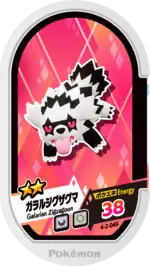 Galarian Zigzagoon (Japanese: ガラルジグザグマ Galarian Jiguzaguma) is a Grade 2 Pokémon Mezastar tag. It is part of the second Gorgeous Star set.