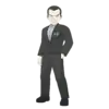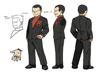 In most of the games he appears in, Giovanni is depicted as a tall, middle-aged man. He has very short, flat, dark hair and small dark eyes. He wears a long sleeved black shirt with a large V-neck that shows off a white undershirt, black slightly baggy trousers, and black shoes. On the left side of his shirt is the red Team Rocket logo.
