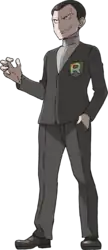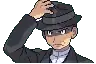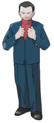In Pokémon HeartGold and SoulSilver and Pokémon Black 2 and White 2, he wears a black trench coat with a red pocket square instead of his usual black shirt. He also wears a black fedora hat.