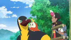 In the midst of the battle, Hatenna spots some of the Mankey looking at a tree on the opposite shore and realizes something. When several of Annihilape's Shadow Balls end up striking the pack of Mankey, they grow angry as well and start attacking Annihilape, much to the group's surprise. While Dot figures that her theory on Annihilape being a guardian deity is incorrect, after all, Hatenna comes up to them and points out what's on the other side of the river: a large supply of Berries at the base of another tree. Figuring the Berries belong to the Mankey, the group realizes that the Mankey had grown angry because they had previously used the vine hanging between the two trees to cross the river and reach their food storage, but are now unable to do so. To fix the situation, the group constructs a new bridge out of straw and logs, which Hatenna helps attach to the tree on one side of the river, while Roy flies to the other side with Kilowattrel and attaches the other end of the bridge of the Berry storage tree. The Mankey, Primeape, and Annihilape excitedly cross the river using the new bridge and reach their food storage once more. Liko and Dot follow them and are feeling happy for them. Liko thanks Hatenna for figuring out what was wrong, and is surprised to notice a brief glow around her Pokémon.