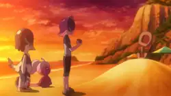 At sunset, everyone bids Gholdengo farewell as Dot looks at Gimmighoul with a contemplative look. Ludlow, whose back is still recovering from him becoming Mighty G for a lengthy period earlier, meets up with Liko and Roy as they tell him how their day went excitingly when they see Dot talking with Gimmighoul. Having been controlled by the Coin Chest Pokémon plenty of times, Dot wondered how to stop it from happening until she saw how Gimmighoul idolized Gholdengo like she does with Iono. Being able to understand how Gimmighoul feels about this, Dot decides to help Gimmighoul collect coins and asks to catch it, which Gimmighoul agrees to happily, joining her team. Even though Dot tells Gimmighoul there's no need for it to control her or her Pokémon again since they're a team now, it still does so later when Dot was telling Mollie about her newest capture.