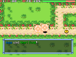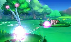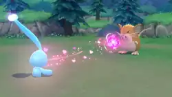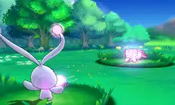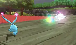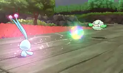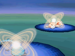 The ends of Manaphy's antennae glow pink and each produces pink energy from them. The two energy balls find a Pokémon or human, and when both energies touch the opponent, their souls are switched. The switched bodies have their own voice, and their eye color changes to light blue. After a while, the effects fade. | ||