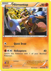 Hitmontop (Japanese: カポエラー Kapoerer) is a Fighting-type Basic Pokémon card. It is part of the Furious Fists expansion.