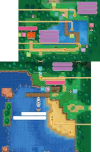 Route 104 is split into two segments, south and north, with Petalburg Woods lying between. A land-based path winds from Petalburg City in the south, through Petalburg Woods, and finally to Rustboro City in the north. Surfing south into the sea in the southern segment will also lead into Route 105. For a while after his Peeko is rescued, Mr. Briney will also ferry the player directly to Dewford Town or Slateport City on his boat.