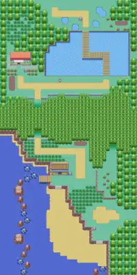 On the north side of the pond, the entrance to Rustboro City lies to the northwest following the beaten path, the sides of which are dotted with a few persistent puddles. To the east of the bridge, Fisherman Ivan is eager to battle if spoken to, and farther east at the edge of the route is a bed of soft soil and an old woman who will give out a Chesto Berry.