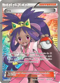 Iris was introduced as a Supporter card in the Pokémon Trading Card Game during the English Black & White Series (the Japanese BW Era). First released in the Japanese Megalo Cannon expansion, it later debuted in English in the Plasma Blast expansion, with both prints featuring an illustration based on the Yusuke Ohmura artwork of the character. It was also released as a Full Art card, with an illustration by Kagemaru Himeno. Iris causes all attacks by the player's Pokémon to deal 10 more damage against the opponent's Active Pokémon for each Prize Card the opponent has taken.