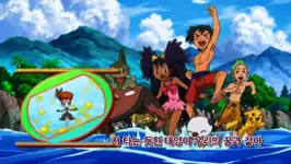 Pansage, Axew, Pikachu, and Oshawott are sitting on treble clefs; Pansage being on the orange treble clef, Pikachu and Axew being on the magenta treble clef, and Oshawott being on the green treble clef bobbing their heads. All four of the Pokémon leap off the treble clefs and land the floor where Meloetta in its Pirouette Forme dancing. They dance with it following its dance moves. Meloetta is then in a small screen on the bottom and there's a Scraggy and a Sewaddle. The Scraggy pulls up its "pants" as the Sewaddle looks up as it opens its leaf clothing. The scene switches to Axew, Pikachu, Smoochum, and Pichu drinking glasses of Moomoo Milk as a Miltank watches with a big smile on her face. The Pokémon smile once they get done drinking it. The scene switches to Mime Jr. and Ditto. The Ditto transforms into a Charizard, amazing the Mime Jr. as Ditto (as Charizard) roars. The scene then switches to a Lopunny and Gothita walking across gold floor looking proud. The scene switches to a Piplup and Oshawott swimming across a body of water looking somewhat determined. The scene then switches to a Vullaby and a Cubchoo shaking their bottoms to the screen. They reveal their faces. A Vanillite, Snivy, Tepig, Oshawott, Axew, and Pikachu are walking on the earth. Some blue dust appears transitioning back to Bulbasaur, Jigglypuff, Charmander, Pikachu, and Croagunk dancing Meloetta's dance moves. There was an image panning down of Ash, Iris, and Cilan all in their swimsuits running in a shallow body of water, Pikachu is running next to Cilan while Axew is on Stunfisk's back, whose leaping in the water. Another panning image appears of Ash, Iris, and Cilan watching the sunset on the beach with their Pokémon. The scene goes back to Meloetta dancing with Pansage, Axew, Pikachu, and Oshawott.