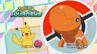 Ash and Goh arrive in Mauville to find the city half-buried in sand. With a new Pokémon mystery to uncover, Ash quickly cheers up. Putting on their Go-Goggles, the boys and their Pokémon walk directly into the sandstorm. They brave the vortex winds to reach the eye of the storm where they rush towards the distant cries for help. As three people are dragged into a pit, a Trapinch appears, snapping its jaws. Goh consults his Pokédex, learning that Trapinch digs bowl-shaped pits to trap and hunt prey. Goh decides he will have to catch the Trapinch to save the people. A standard throw fails, but his curveball manages to catch the Trapinch. The three people thank their rescuers before leaving.