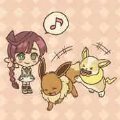 The familiar bark instantly gets Chloe's attention. Managing to excuse herself from the test, Chloe greets Yamper outside, wondering what he is doing at the school. Yamper beckons Chloe to follow him, and he leads her to the school rose garden to meet Eevee. Chloe is speechless and stares intensely at Eevee for several moments. Yamper interrupts the moment when he spots the lab assistants searching nearby. Chloe hushes Eevee before bundling her up to keep her safe, while the assistants walk past not noticing anything. Chloe soon gives Goh a call to meet her outside. Goh finds Chloe, Yamper and the Eevee hiding behind a hedge. He is quickly overcome with excitement at the sight of Eevee, revealing that Eevee has eight possible Evolutions. Chloe admits she is hiding because it appears that some people are chasing after Eevee, and points to the suspicious lab assistants wandering nearby. Goh comes up with a plan, so he approaches the suspicious people directly while Chloe tries to escape undetected. His forthrightness leaves them both stunned, but the lab assistants soon spot Chloe carrying Eevee away. Goh resorts to tackling them, allowing Chloe to make a clean getaway.