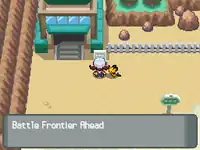 Lyra reading a sign next to the gate that leads to the Battle Frontier in Generation IV