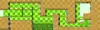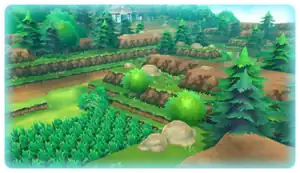 East of the second section of the ledges, the route curves south and then east near a large patch of tall grass containing wild Pokémon, which takes up most of the area. This patch, which contains another Trainer, follows the route until it turns north ahead of a hill. From this point, the route makes a backward "S" curve, turning east past the hilly terrain, south past another ledge that leads the route to a large clearing, east again, and finally north, passing a second patch of grass near the end, which has a fence around it as well as a signpost for directions.