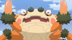 Klawf is a crustacean Pokémon. It is primarily orange in color, with a cream underbelly and pink cheeks that can glow red. Its stony, armored carapace has a rugged texture, with three roughly pentagonal shapes protruding from the top. Its eyes are supported by stalks extending from inside its shell; Klawf can rotate these eyes freely in any direction to survey its surroundings.[1] Klawf's mouth is large and has rectangular "teeth" resembling battlements. Klawf has eight appendages, with claws on its two front-most limbs. Black fur-like bristles protrude from between its eyes and cover its joints.