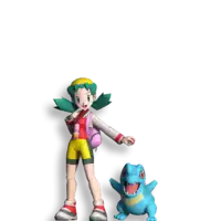 Kris's design is based on her appearance in Pokémon Crystal. Totodile is one of the first partner Pokémon of Johto in the core series games. In addition, Kris's animated series counterpart has been depicted with Totodile and its Evolutions. Totodile, Croconaw, and Feraligatr's Dex entries come from Pokémon Ruby and Sapphire.