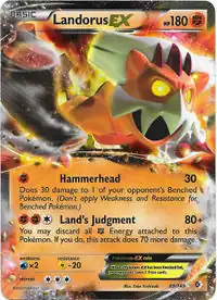Landorus-EX - Landorus-EX's Hammerhead Attack dealt 30 damage plus 30 to a benched Pokémon. With 3 energies, it could also use Land's Judgment for up to 150 damage, easily knocking out most Pokémon with other modifiers.