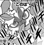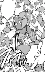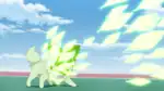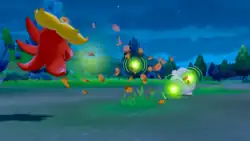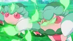 The leaves around Sprigatito's neck glow light green, and it releases multiple green glowing leaves from them at the opponent. Sprigatito can control the speed and intensity of these leaves. | ||