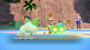 The leaves around Sprigatito's neck glow, and it releases multiple glowing leaves from them at the opponent. | ||