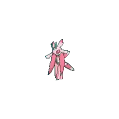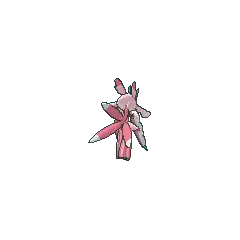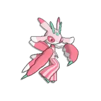 Lurantis is a plantlike Pokémon that resembles a mantis. The top half of its head is light pink, while the bottom half is white. It has light red eyes, and two green antennae with a small green lump between them. There are four extensions to the top half of its head: two on the top with red tips that resemble ears, and one on each side with white tips that resemble stylized hair. It has a light pink body with wavy, skirt-like extensions around the waist and a green abdomen and neck. Its thin, white arms end in large, red scythes with white along the bottom rim and a single green claw on the tip. There are vertical, pink-and-red stripes down its legs, which have small, pointed green feet. The coloring and shape of Lurantis's body and arms give it the appearance of wearing a long-sleeved dress, while its legs are similar to pants. Four red, wing-like appendages sprout from its back, each tipped with white.
