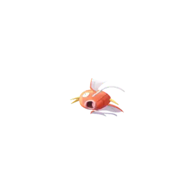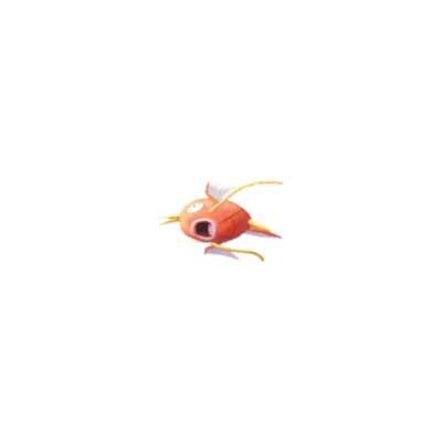 Magikarp is a piscine Pokémon with large, heavy reddish-orange scales. It has large, vacant eyes and pink lips. Its pectoral and tail fins are white. On its back is a stiff, three-peaked yellow fin, resembling a crown; there is an identical fin on its underside. It also has long barbels. The barbels are white on a female and pale-yellow on a male. A long-lived Magikarp is able to utilize its immense splashing power to leap high enough to scale mountains. It also has a strong enough immune system to survive in the most polluted of waters. However, it is usually overlooked by Trainers because of its perceived weakness: even in the heat of battle, it will do nothing but flop around. It is believed that the ancestors of Magikarp were actually much stronger than modern Magikarp, and this led scientists to research this species.