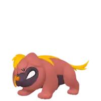 Maschiff is a brown, quadrupedal, canine Pokémon, with a dark gray snout and underside. It has a layer of thick fat under its skin that protects it from attacks. Its paws have four toes each. It has yellow tufts of fur on its head and back; the head fur makes the appearance of a crest. It also has a long, yellow, brushy tail. Its head has droopy triangular ears with yellow insides, and black beady eyes below two protuberances on its forehead that seemingly give it a constant anxious expression. Its snout contains a rounded triangular orange nose and a large mouth, with strong jaws and sharp fangs that can crush boulders.