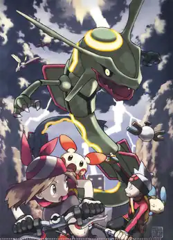 Rayquaza is May's fifth known Pokémon. Zinnia summoned it to the Sky Pillar to stop a giant meteorite headed for Hoenn, but was unable to trigger its Mega Evolution. After May had fed Rayquaza her Meteorite, Zinnia let May battle and catch Rayquaza. Afterwards, May used Rayquaza in its Mega Evolved form in a battle against Zinnia's Mega Salamence.