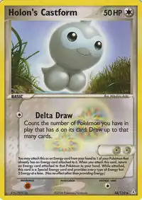 Holon's Castform – Holon's Castform was the deck's ideal starting Pokémon. For , its Delta Draw attack allowed the player to draw one card for each δ Pokémon they had in play. With Holon Mentor, the chances of being able to Delta Draw several cards early in the game were high. Holon's Castform often allowed Metanite to build up a massive hand by the third or fourth turn, or forced the opponent to expend resources to knock it out early. It was all the more versatile since it could be attached as a Special Energy card later in the game, making techs such as Latios playable.
