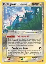 Metagross δ – Metagross δ was the deck's main attacker. Its Crush and Burn attack, combined with Dragonite δ's Delta ChargePoké-Power could consistently deal massive damage to opposing Pokémon. Metagross δ's Delta Control Poké-Power greatly benefited the deck's consistency as well. It allowed a player to choose one of the top four cards of their deck and add them to their hand. The other three cards were returned to the deck.