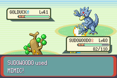 Sudowoodo instantly copies the last move used by the opponent. Sometimes, the branches on its head will glow gold. | ||