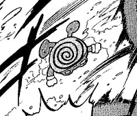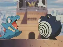 Misty used Poliwhirl in the second and third rounds of the Whirl Cup in The Perfect Match!. In the second round, Poliwhirl went up against Ash's Totodile. Ash started the battle by having Totodile use Water Gun, but Poliwhirl dove underwater to evade it. Poliwhirl jumped out of the water and attacked with Bubble, dazing Totodile for a while. Poliwhirl attempted to use Double Slap, but Totodile dodged and headbutted it back into a pillar. However, Poliwhirl kicked off the pillar and dove towards Totodile, using Double Slap again, and knocking Totodile out. Ash recalled Totodile and sent out Kingler. Misty again commanded Poliwhirl to unleash another Bubble, but Kingler used Crabhammer first. An energy sphere was sent across the arena, causing whirlpools to form. The attack knocked Poliwhirl into the whirlpools, and another Crabhammer attack knocked Poliwhirl out.