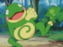 After evolving into Politoed, it became particularly cheerful. Its habit of clapping, even at inappropriate moments or when being scolded, often irritated Misty. However, its excellent rhythm proved useful in I Politoed Ya So!, where it took up cheerleading with Tammy's Pokémon cheer squad. Tammy rekindled her interest in entertaining audiences with cheers rather than winning tournaments, while her own Politoed, nicknamed Bean, learned Misty's Politoed's clap routine. Politoed also continued to show its affection toward Misty in that same episode, running joyously toward her when she had found it at Tammy's home.