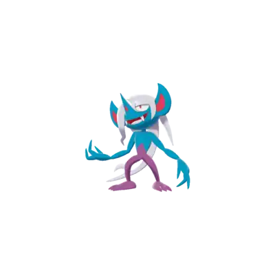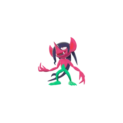 Morgrem is a somewhat humanoid Pokémon, with a magenta upper body and a light green lower body divided by a zig-zag line. It has long, lanky arms with hands that have three sharp fingers, and round feet that have three toes. Just like its pre-Evolution, Morgrem has prominently large ears and eyes, long white fangs, a purple tongue, and an upturned nose with a single nostril. However, Morgrem's pupils are red instead of black, and its nose is longer. Morgrem has long, black hair with a bang that covers its right eye; the end of the hair is shaped like a pole arm.