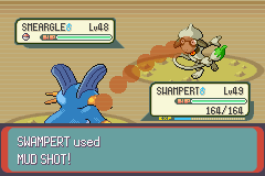 Swampert fires a huge ball of mud at the opponent from its mouth; or, Swampert fires multiple glowing light blue balls at the opponent from its mouth; or, Swampert fires a stream of dark brown mud from its mouth at the opponent. | ||