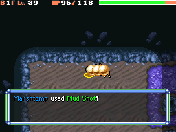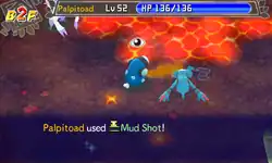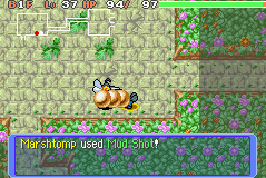 Marshtomp fires a large ball or multiple smaller balls of mud at the opponent from its mouth; or, Marshtomp fires a stream of brown mud at the opponent; or, Marshtomp fires light blue energy balls from its mouth at the opponent. When the balls hit the opponent, they turn into mud. | ||