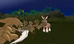 The inside of Diggersby's mouth glows orange. It then fires multiple balls of mud from its mouth at the opponent; or, Diggersby creates a golden sphere of energy from between its ears. The sphere splits into several balls of mud, which are then fired at the opponent. | ||
