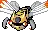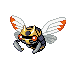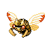 Ninjask is a small, cicada-like Pokémon with two pairs of wings. Its body is mostly black with accents of yellow and gray. Most of its head is yellow, but there is a solid band of black between its gleaming red eyes. The band expands into a circular pattern on its forehead, between two pointed crests on the sides of its head. The underside of its head is gray and segmented, making it somewhat resemble a veil. On its back is a patch of black with a stretch of yellow, shaped like an upside-down letter Y. Most of its carapace and abdomen is black, but there is a ring of yellow near the tip. Its gray insectoid arms extend from its chest and usually have their small, yellow claws turned inward. There is a similar pair of back legs. It has large, veined wings with triangular, red tipping.