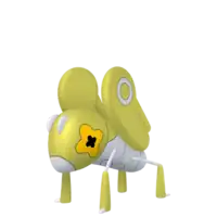 Nymble is a gray, oblong, insectoid Pokémon resembling a grasshopper, with dark gray colorations on its face, back, and legs. Its head has two stubby semicircular antennae, a circle on its snout resembling a mouth or nose, and yellow compound eyes shaped like rounded crosses, complete with cross-shaped black pupils. Its body is divided by lines into multiple segments, and it has an X-shaped pattern on its underside. It has six legs: two pairs of legs are located on the sides of its body, and each of the forelimbs is dark gray and contains a single claw. The third pair of legs is located above its body and is much larger; they are oblong in shape and solid dark gray in color, with light gray ring patterns over the joints. Nymble usually keeps its third set of legs folded up.