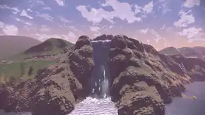 Obsidian Falls is a large waterfall located at the bend of the river that runs north to south in the eastern part of the fieldlands. Small islands with items are located around the base of the waterfall and the adjacent cliff shorelines, which can be accessed with Basculegion. At the peak of the waterfall, ore deposits scatter the surrounding area. The land at the top of the waterfall generally slopes downward, with some parts flattening horizontally.