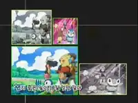 The 2 frames on the right show Together. Ash, Pikachu, Brock and Dawn are on the top of a tree while flying Pokémon, like Altaria, Fearow and Murkrow, along with non-Flying types like Misdreavus are flying in the background. A Chatot flies near the camera. On a tree's branches, three Cherrim, a Kricketot, a Pachirisu, a Burmy and a Budew are dancing with happy faces. Ash and his friends are chasing a Glameow in a city. The Glameow runs towards an alley. Then, they are crossing a Bibarel's dam and exploring a dark cave, where they find a Drapion. Images of Ash, Dawn and Brock with their Pokémon appear. Then, an image featuring Professor Oak, Tracey, Delia and Mimey appears, followed quickly by images of Johanna, Professor Rowan, Nurse Joy, Officer Jenny and a Super Contest. Then, with a picture of Paul with a serious face as a background, Ash sends out Turtwig, Staravia, Pikachu and Buizel, showing their moves Razor Leaf, Wing Attack, Volt Tackle, and Aqua Jet, respectively. Ash and Paul are fiercely looking at each other, standing with their Pokémon. Dawn sends out Piplup and Buneary, from two Poké Balls inside of capsules. Dawn and Zoey appear, and then Team Rocket does, smiling, with their Pokémon. Ash and his friends are riding jet skis while Mantyke and Buizel jump over them and Manaphy appears. Meanwhile, Palkia and Dialga are roaring, although they are in distant places; while Lucario is looking at them. Ash, Pikachu, and Brock are sitting on a giant Poké Ball, and Dawn is sitting in front of it. They all smile. These scenes repeat from the beginning to Ash and his friends chasing a Glameow down a narrow alley.