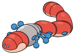 Orthworm is a long, worm-like Pokémon with a six-segmented metal body. Its body is red on top and light orange on the bottom, except for its second segment, which is steel-colored. The first segment is its head, which contains its small, pale blue eyes and a large, toothless mouth. There are pairs of cyan ovals lining either side of its body from its third to fifth segments, while its second segment has three of such pairs. Parapodia-like tendrils can extend from the ovals on its second segment, which resemble simple fists.