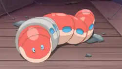 When threatened, Orthworm uses its blue fist-like parapodia to pelt its opponent with a storm of punches. It lives in dry deserts, and eats iron from the soil to maintain its body. It is sometimes seen buried in the ground, with only its head visible.