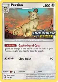 Persian (Japanese: ペルシアン Persian) is a Colorless-type Stage 1 Pokémon card. It was first released as part of the Unbroken Bonds expansion.