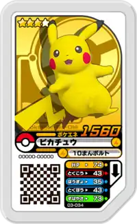 Pikachu (Japanese: ピカチュウ Pikachu) is a Grade 3 Pokémon Ga-Olé disk. It is part of the third set.