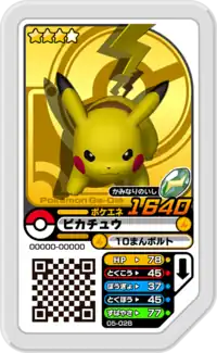 Pikachu (Japanese: ピカチュウ Pikachu) is a Grade 3 Pokémon Ga-Olé disk. It is part of the fifth set.